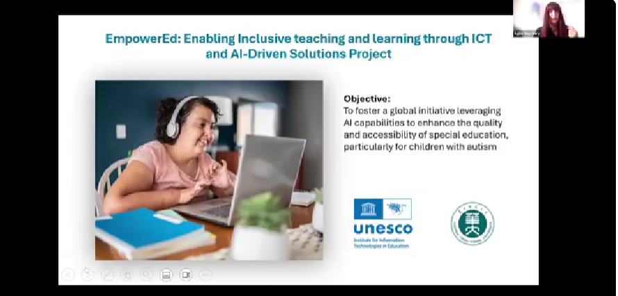 Central China Normal University (CCNU), a close collaboration partner of UNESCO IITE, was represented by Professor Jingying Chen, who delivered welcome remarks during the first webinar and underscored the importance of international cooperation in advancing inclusive education with AI supported education tools. Assoc. Prof. Li Rui contributed to the second webinar with a presentation of the best practice Star Future-A Human Computer Interaction-Based System for Evaluation and Intervention of Children with Special Needs.